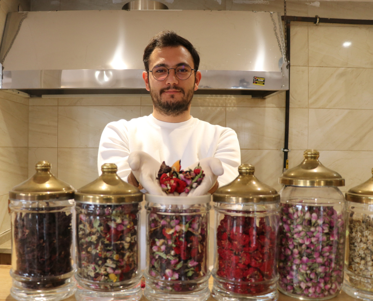 Sivas’ta bir kafede 50 farklı bitki çayı, müşteriler ve işletmecinin ortak kararıyla verilen ilginç isimleri ve renkleriyle yoğun ilgi görüyor.