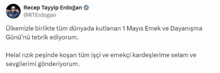 "Ülkemizle birlikte tüm dünyada kutlanan 1 Mayıs Emek ve Dayanışma Günü’nü tebrik ediyorum. Helal rızık peşinde koşan tüm işçi ve emekçi kardeşlerime selam ve sevgilerimi gönderiyorum."