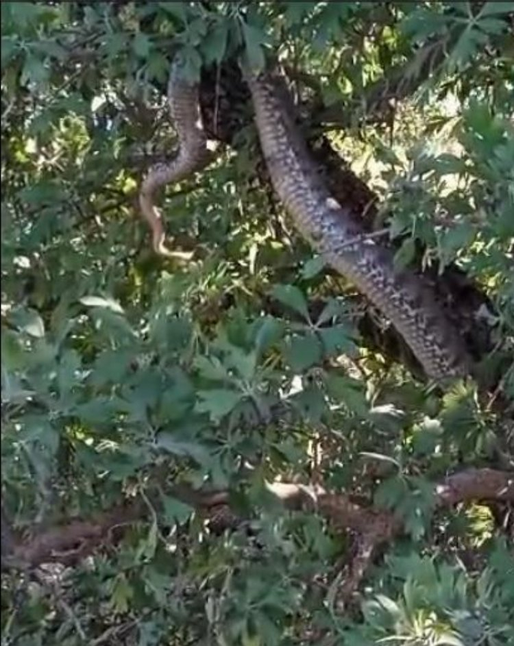 Ağacın üzerindeki devasa yılan, görenleri hayretler içerisinde bırakırken, dev yılanın avlanmak için ağaç üzerine çıktığı belirtildi.
