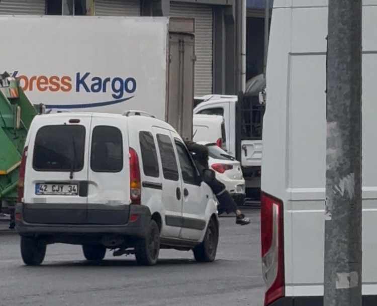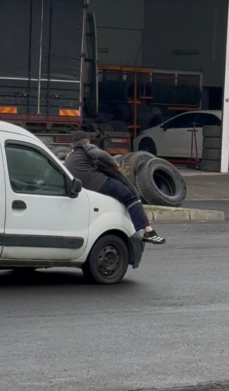 Seyir halindeki aracın kaput kısmına oturan usta, buradan gelen sesin kaynağını bulmaya çalıştı. O anlar cep telefonu kamerasına yansırken, izleyenler kendilerini gülmekten alamadı.
