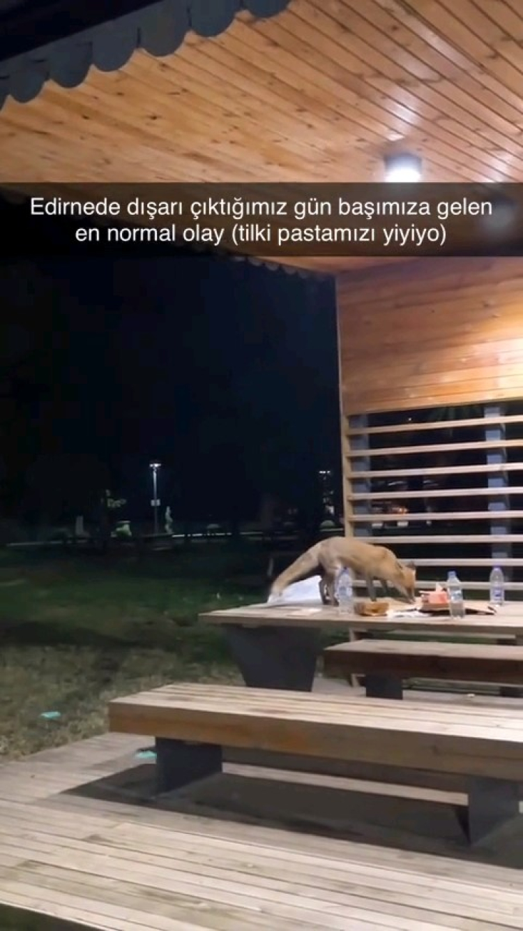 Tilkinin pastayı yemeye çalıştığı anlar, cep telefonu kamerasıyla saniye saniye kaydedildi. Görüntülerde tilkinin masaya çıkıp pastayı kokladığı, ardından etraftakileri fark edince hızla kaçtığı görüldü.