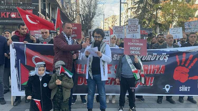 Siirt'te doktorlar giydikleri beyaz önlüklerle İsrail'in Gazze'ye yönelik saldırılarına tepkilerini sürdürüyor.