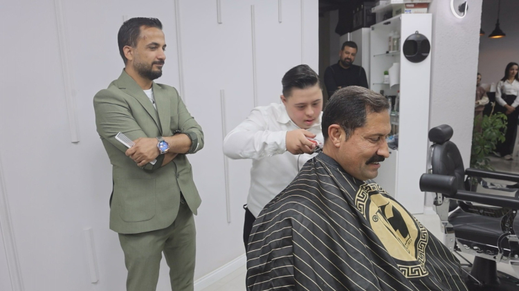 Hatay'da down sendromlu kuaför Şükrü Dağlı'nın 3 Aralık Dünya Engelliler Günü'nde ilk müşterisi Vali Mustafa Masatlı oldu.