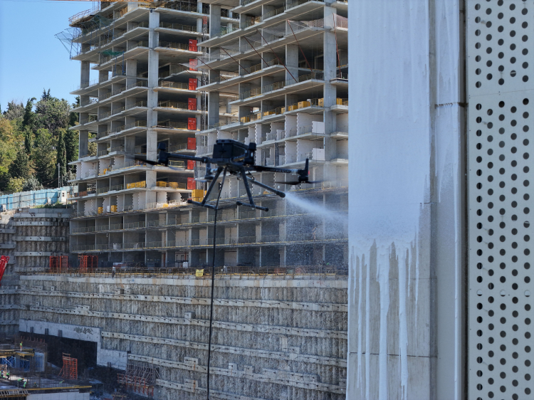 Dünya’da birçok ülkede farklı amaçlarda kullanılan dronlar Türkiye’de bir arge firmasının geliştirdiği proje ile dış cephe temizliği yapıyor. Firma yaz aylarında artan orman yangınlarına hızla müdahale etmek için yangın söndürme projesi üzerinde çalışıyor. Yapılan dış cephe temizliği projesinde dron üzerine entegre edilen bir temizleme başlığı ve hortumu bulunuyor. Hortum yer istasyonuna bağlı bir şekilde dron uçuşunu gerçekleştirebiliyor. Dron öncelikle hazırlanan özel temizleme köpüğünü dış yüzeye uyguluyor. Daha sonra basınçlı su ile köpük uygulanan alan temizleniyor. 15 katlı 2000 metrekare bir bina 1 günde dron ile temizliği yapılıyor. Dağcılar veya vinç yardımı ile bu süre 2-3 güne kadar çıkabiliyor.