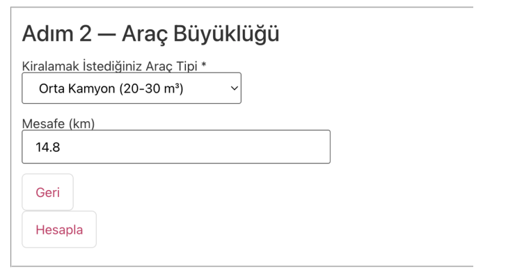 Kamyon kiralama sayfasında hızlıca seçilen adreslere göre yine Google altyapısının sunduğu imkanlar ile mesafe hesaplaması otomatik olarak yapılabilmektedir.