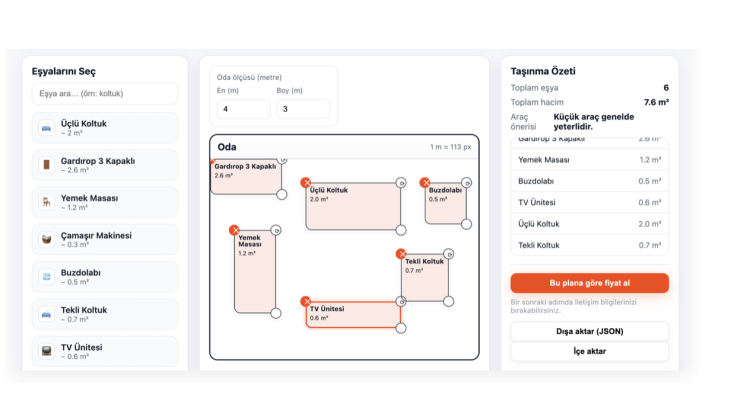 Bu sayfada da yukarıda yer alan online araç ile odanızda yer alan eşyalar tamamen özelleştirilebilir oda ölçüleri belirlenerek simüle edilebiliyor. Yukarıda görüleceği üzere istenen eşyalar ile istenen şekilde bir yerleşim yapılarak bu eşyaların toplam ne kadarlık bir yer kaplayacağı ve ne kadarlık bir araç gerekeceğine yönelik de yine bu sayfadan kolayca bilgi alınabilir.