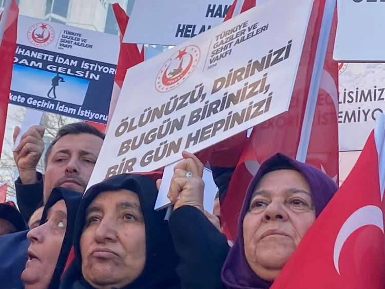 Şehit ve gazi yakınları protesto gösterisinde “Selahattin Demirtaş teröristtir”, “Vatana kurşun sıkanın sonu sarı torba” yazılı pankartlar açtı.