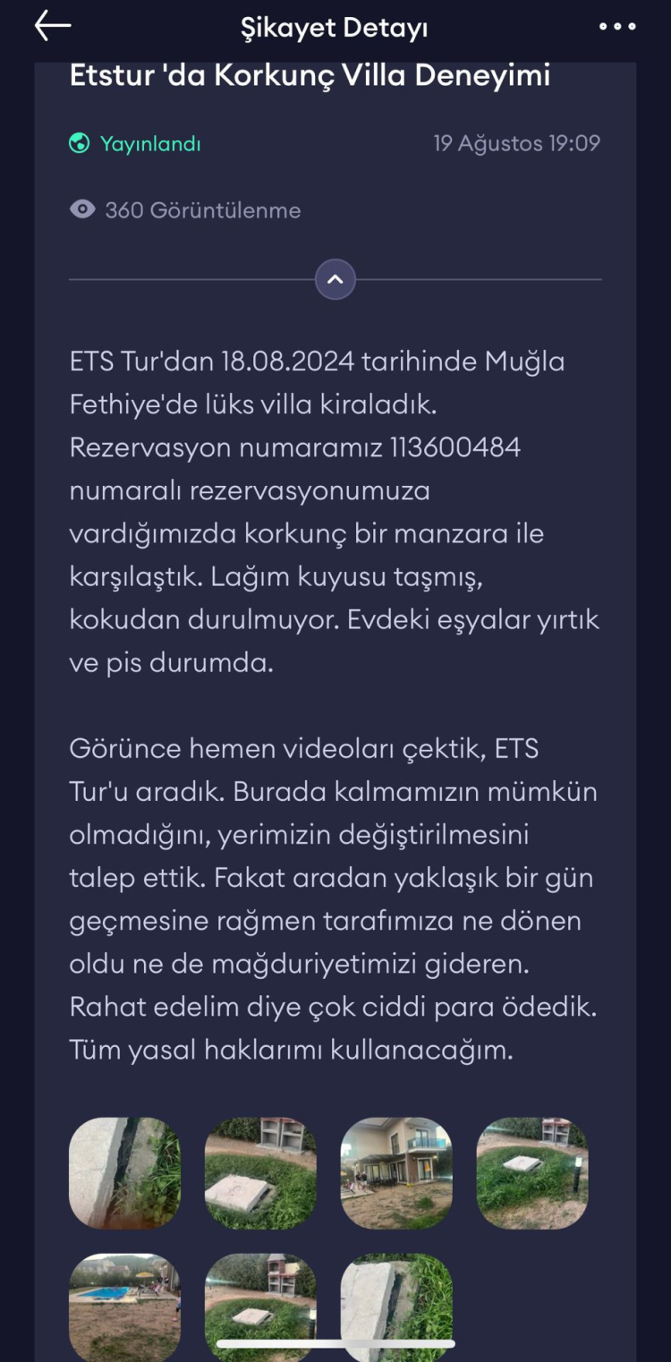 Fethiye'de ailesiyle birlikte güzel bir tatil planı yapan Ali Oktay, ETS Tur'dan beğenip kiraladığı villada karşılaştığı manzara karşısında hayal kırıklığına uğradı. Fotoğraflarda cazip görünen villa, taşan fosseptik çukuru, kirli koltuklar ve yosun tutmuş havuzla gerçek bir kabusa dönüştü. Ailesiyle birlikte bu şartlarda kalamayacağını anlayan Oktay, villayı kiraladığı acente ile iletişime geçti. Firmadan çözüm bulamayan ve büyük mağduriyet yaşayan Oktay, çareyi kendi imkanlarıyla başka yere gitmekte buldu. Oktay'ın, acenteden 69 bin liralık ödemesini geri alabilmesi ise tam 5 gün sürdü ve tatili zehir oldu.