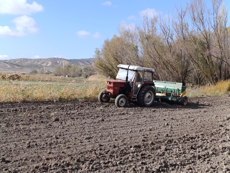 Mihalıççık ilçesine bağlı Yunusemre Mahallesi'nde 35 yıldır çiftçilik yaparak geçimini sağlayan 54 yaşındaki Hüdayi Turgut, tarlarında hububat ekimini gerçekleştirdi. Ekim için sezon sonuna doğru gelindiği belirten Turgut, Allah'tan bereketli bir yıl dilediklerinin altını çizdi. Hububat ekimi yaptığı tarım arazilerinin genelinin kıraç olduğunu belirten çiftçi, yağmura her yıldan daha çok ihtiyaçlarının olduğunun altını çizdi. Bu yıl ekim yapmadan önce yağan yağmurların yüz güldürdüğüne değinen, tüm çiftçilere bereketli bir yıl diledi. Hüdayi Turgut, önceden sürülmüş toprağına arpa ve buğday tohumlarını mibzer yardımıyla ekti.