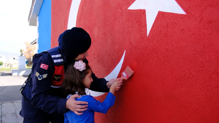 Etkinlik kapsamında jandarma personeli, öğrencilerle birlikte fırçaları ellerine alarak, okul duvarına al yıldızlı dev Türk bayrağını çizdi. Duvara nakşedilen bayrağın etrafı da hep birlikte boyanarak, tamamlandı. Boyama sürecinin ardından öğrencilere rengarenk balonlar, Türk bayrakları ve çeşitli hediyeler dağıtıldı. 29 Ekim Cumhuriyet Bayramı, köy okulunda büyük bir coşkuyla kutlandı.