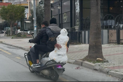 Mersin'in Anamur ilçesi çevresine yağan karı fırsat bilen vatandaşlar o anların keyfini çıkarırken, iki arkadaşın motosikletle kardan adamı taşıması dikkat çekti.