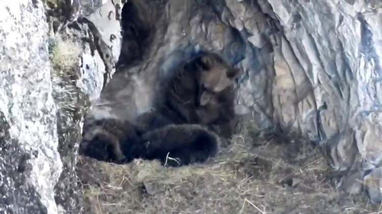 Erzurum’un İspir ilçesi Yedigöller Mahallesi’nde yaşayan ve Dağların oğlu ismiyle bilinen profesyonel dağcı Bülent Erkan, Tüneller bölgesindeki mağarada kış uykusuna yatmayan ayı ailesini görüntüledi.