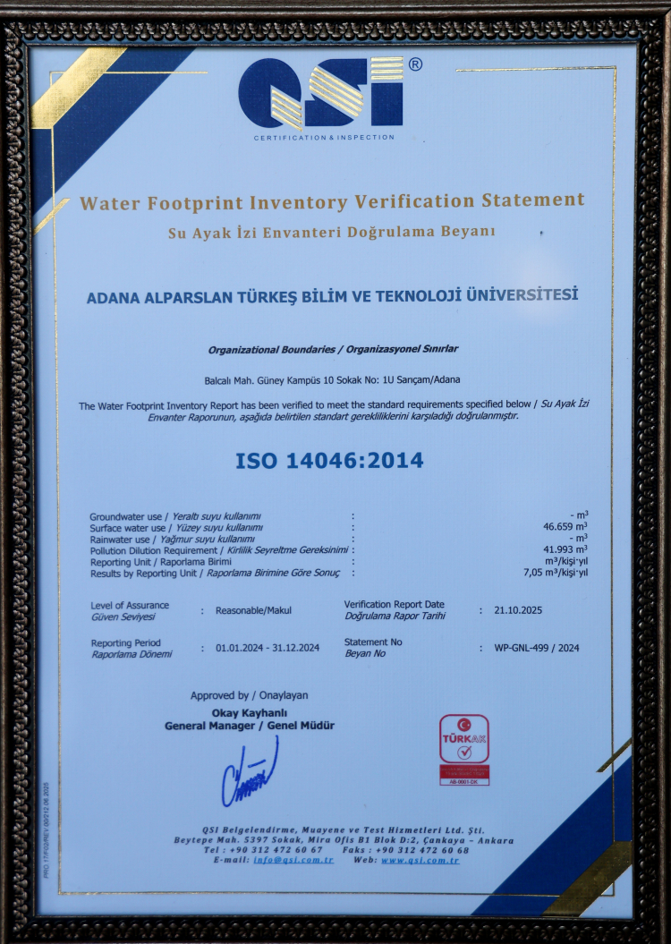 Su tüketiminin küresel ölçekte öneminin arttığı günümüzde ATÜ, çevresel sürdürülebilirlik ve doğal kaynak yönetimiyle ‘Su Ayak İzi Belgesi' aldı. Dünyada ilk kez bir üniversite tarafından uygulanan model olma özelliği taşıyan çalışma kapsamında toplam yüzey suyu kullanımı 46 bin 659 metreküp, kirlilik seyreltme ihtiyacı ise 41 bin 993 metreküp olarak hesaplandı. Bu verilere göre kişi başına düşen yıllık su ayak izi 7,05 metreküp olarak belirlendi. Kampüs genelinde mavi ve gri suya ilişkin envanterler çıkarılırken, tüketim analizleri, geri kazanım planları ve uzun vadeli tasarruf stratejileri belirlendi. Çalışmanın ulusal ölçekte örnek teşkil etmesi bekleniyor.