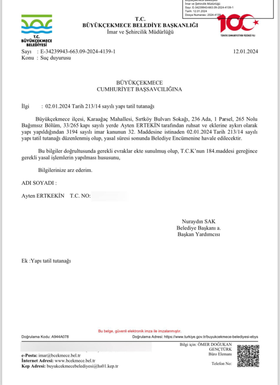 3194 sayılı İmar Kanunu kapsamında 2 Ocak 2024 ve 13 Mart 2024 tarihli Yapı Tatil Tutanağı ve 13 Mart 2024 tarihli 217/9 sayılı Yapı Tatil Tutanağı düzenlenerek yasal işlem başlatıldı. Zabıta ve polis ekipleri, ruhsat ve eklerine aykırı olarak yapılan kaçak yapıları yıkmak için villaya geldi. Daha sonra Büyükçekmece Belediyesinin kepçe ve iş makineleri de kaçak yapının olduğu villanın önünde hazır bulundu. Edinilen bilgiye göre villa sahipleri süre isteyerek kendilerinin yıkacağını belirtti. Villanın sahibi tarafından belirlenen süre içerisinde yıkılmaması halinde belediyece yıkılacağı öğrenildi.