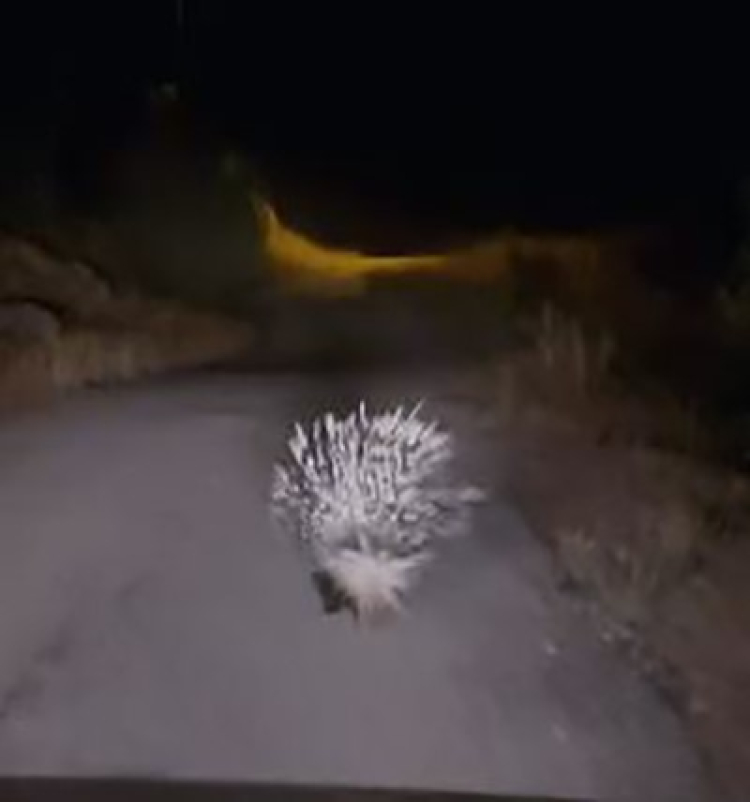 Köy yolunda görüntülenen oklu kirpi daha sonra gözden kaybolurken, o anlar sürücü tarafından cep telefonu kamerası ile kayıt altına alındı.