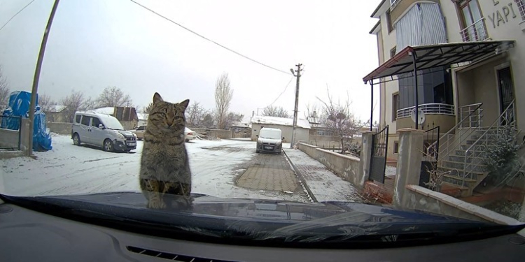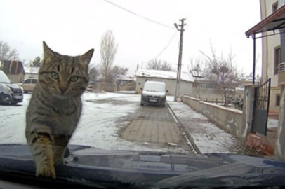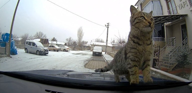 Erzincan'da bir aracın kaput kısmına çıkan sevimli kedi, daha sonra aracın ön camına patileriyle tırmanmaya çalıştı. Soğuktan üşüdüğü için araca sığındığı tahmin edilen kedinin, bir süre sonra büzüşerek ısınmaya çalıştığı anlar araç içi kamerasıyla kaydedildi.