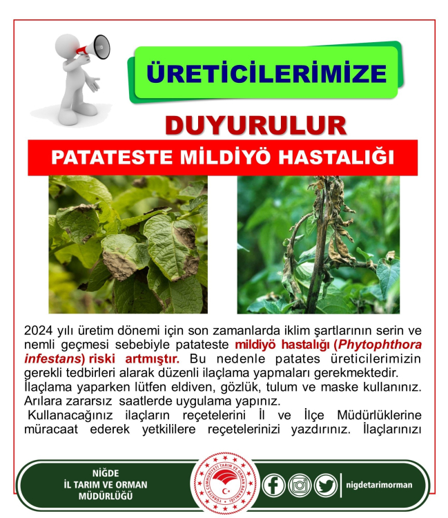 Niğde İl Tarım ve Orman Müdürlüğü tarafından yapılan açıklamada; patateste mildiyö hastalığı riskine karşı, ilaçlama uyarısında bulunularak; "2024 yılı üretim dönemi için son zamanlarda iklim şartlarının serin ve nemli geçmesi sebebiyle patateste mildiyö hastalığı riski artmıştır.