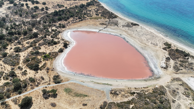 Çanakkale'nin Ezine ilçesine bağlı Dalyan köyündeki Alexandria Troas Antik Kenti'nin 2 bin yıllık iç limanı, zamanla denizle bağlantısı kesilince, doğa şartlarına bağlı olarak kalp şeklini aldı. İçerisindeki tuzlu su da yılın belli dönemlerinde pembe renge dönüşünce ortaya kalpli pembe göl çıktı. Bugünlerde yeniden pembeleşmeye başlayan kalp şeklindeki göl, ziyaretçilerin ilgisini çekiyor. Pembeye bürünen ve kalp şekli ile dikkati çeken 'Kalpli Göl', drone ile havadan görüntülendi. Kalpli göl doğal dokusu bozulmaması ve zarar görmemesi için araç trafiğine kapatıldı. Ziyaretçiler yaya olarak gölün olduğu alanı gezebilecek.