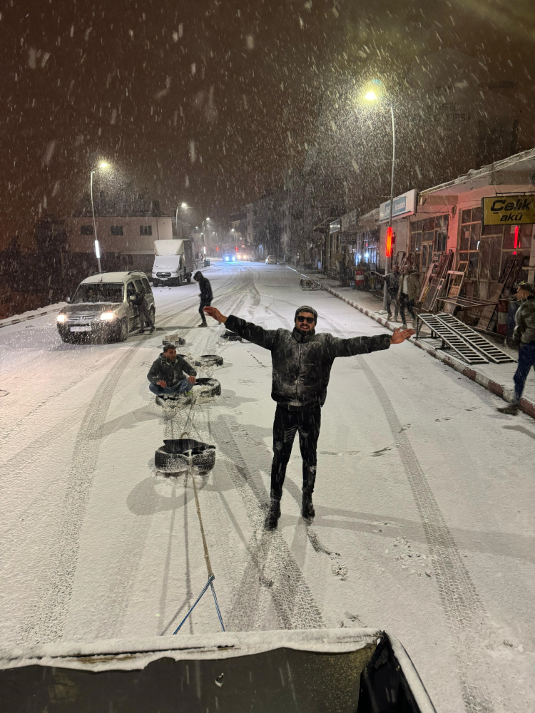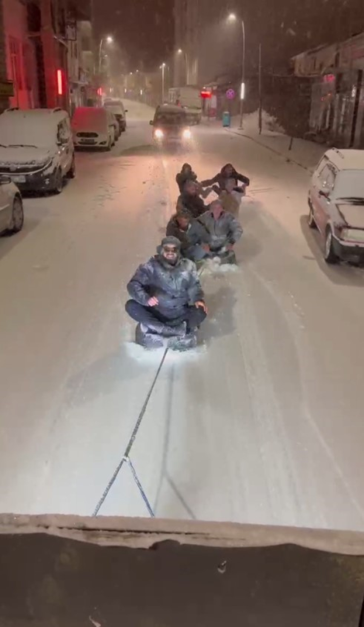 Gümüşhane’nin Köse ilçesinde etkisini gösteren kar yağışını fırsat bilen bir grup kafadar pikap arkasına bağladıkları araç tekerlekleriyle tüm ilçeyi turladı. Kar yağışının etkisini göstermesiyle karla kaplanan ilçe içerisindeki yollarda şarkılar söyleyerek eğlenen ve bu anları sosyal medya hesaplarından paylaşan gençlerin o anları büyük ilgi görürken, izleyenleri ise güldürdü.