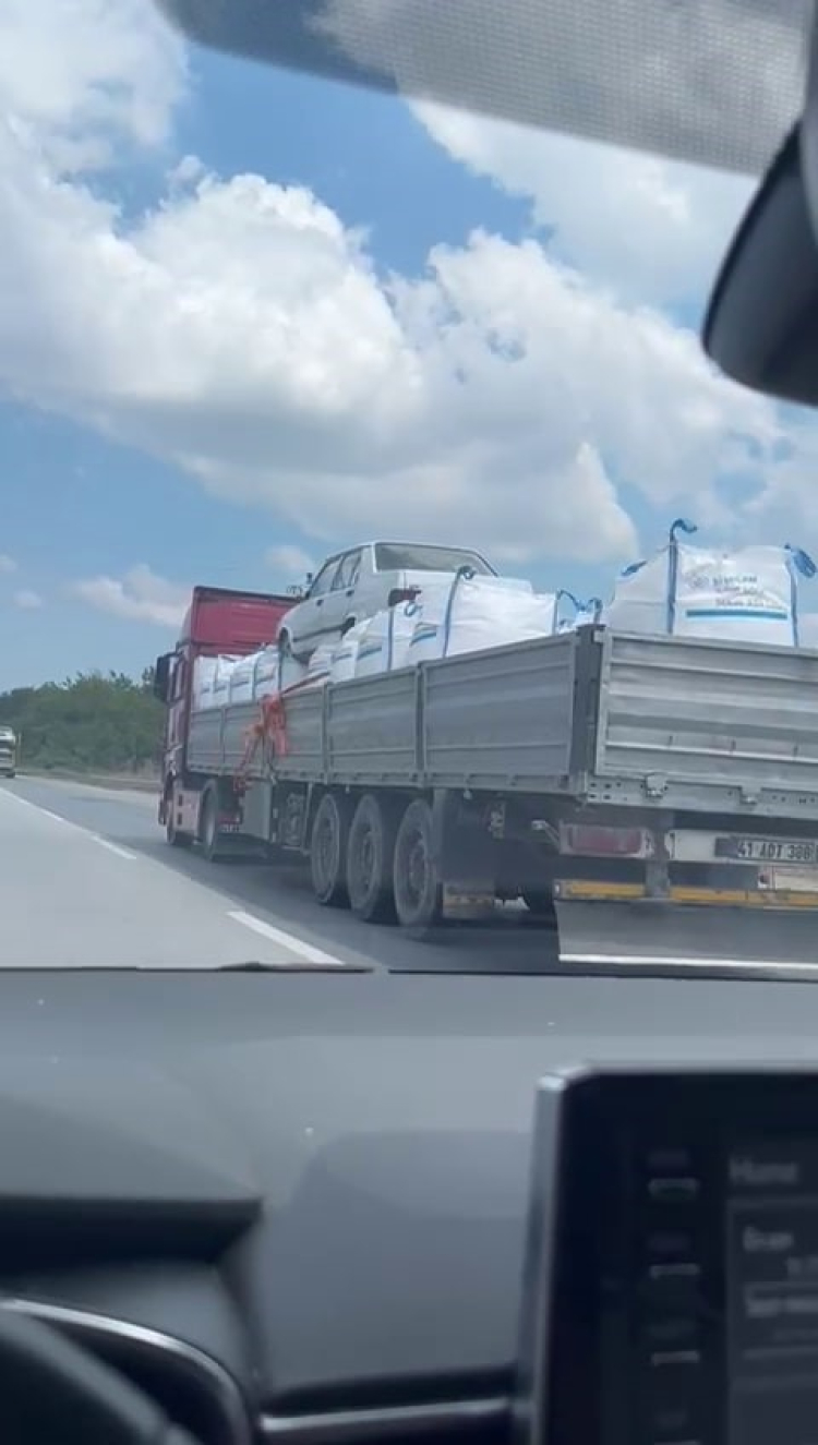 Sakarya D-650 kara yolunda seyir halinde çuval yüklü tırın üstünde otomobil taşındığını görenler hayrete düştü. Cep telefonu kameralarına yansıyan olayda, ilginç manzarayı gören dönüp bir daha baktı.