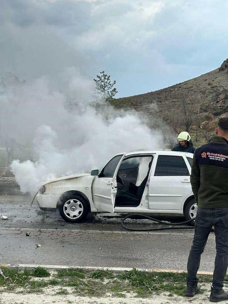 Konya'nın Karapınar ilçesinde, seyir halindeyken alev alan bir otomobil, itfaiye ekiplerinin müdahalesiyle söndürüldü.