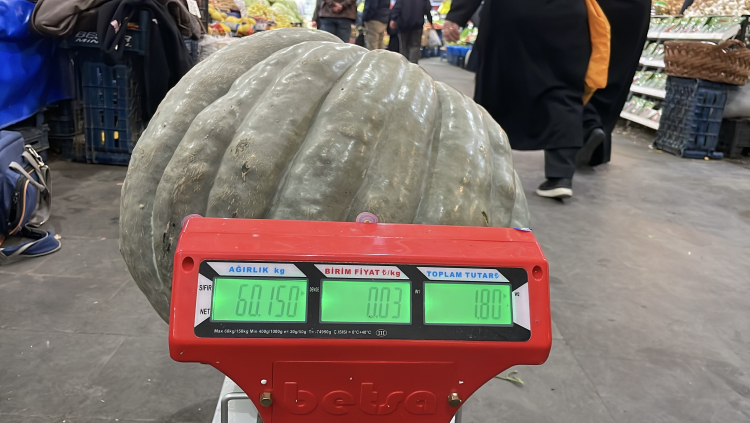 Sivas'ta bir çiftçi, bahçesinde devasa bir bal kabağı yetiştirdi. Bal kabağını satmak için tezgahına getiren esnaf Ferhat Çobanoğlu, gözlerine inanamadı. Ele avuca sığmayan bal kabağını el arabası ile tezgaha taşıyan Çobanoğlu, sergilemeye başladı. 60 kilogram ağırlığındaki bal kabağını ilk kez gören vatandaşlar, dönüp tekrar bakıyor. 57 santimetre boyunda ve 180 santimetre çapındaki bal kabağı, kilosu 30 TL'den satışa sunulacak.