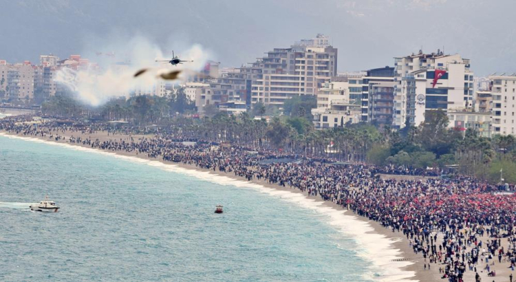 Türk Hava Kuvvetlerinin akrobasi ekibi SOLOTÜRK, Antalya'da 23 Nisan Ulusal Egemenlik ve Çocuk Bayramı kutlamaları kapsamında gerçekleştirdiği gösteriyle binlerce vatandaşı bir araya getirdi. Türkiye Büyük Millet Meclisi'nin açılışının 106'ncı yıl dönümü ve 23 Nisan Ulusal Egemenlik ve Çocuk Bayramı dolayısıyla düzenlenen etkinlikler kapsamında, Türk Hava Kuvvetleri F-16 Akrobasi Timi SOLOTÜRK Antalya semalarında uçuş gerçekleştirdi. Konyaaltı Sahili ile Olbia Kent Meydanı'ndan izlenen gösteri, alanı dolduran vatandaşlara heyecan dolu anlar yaşattı.