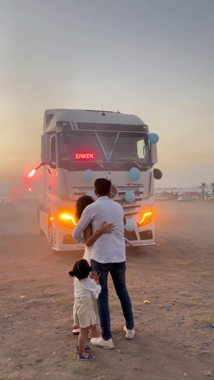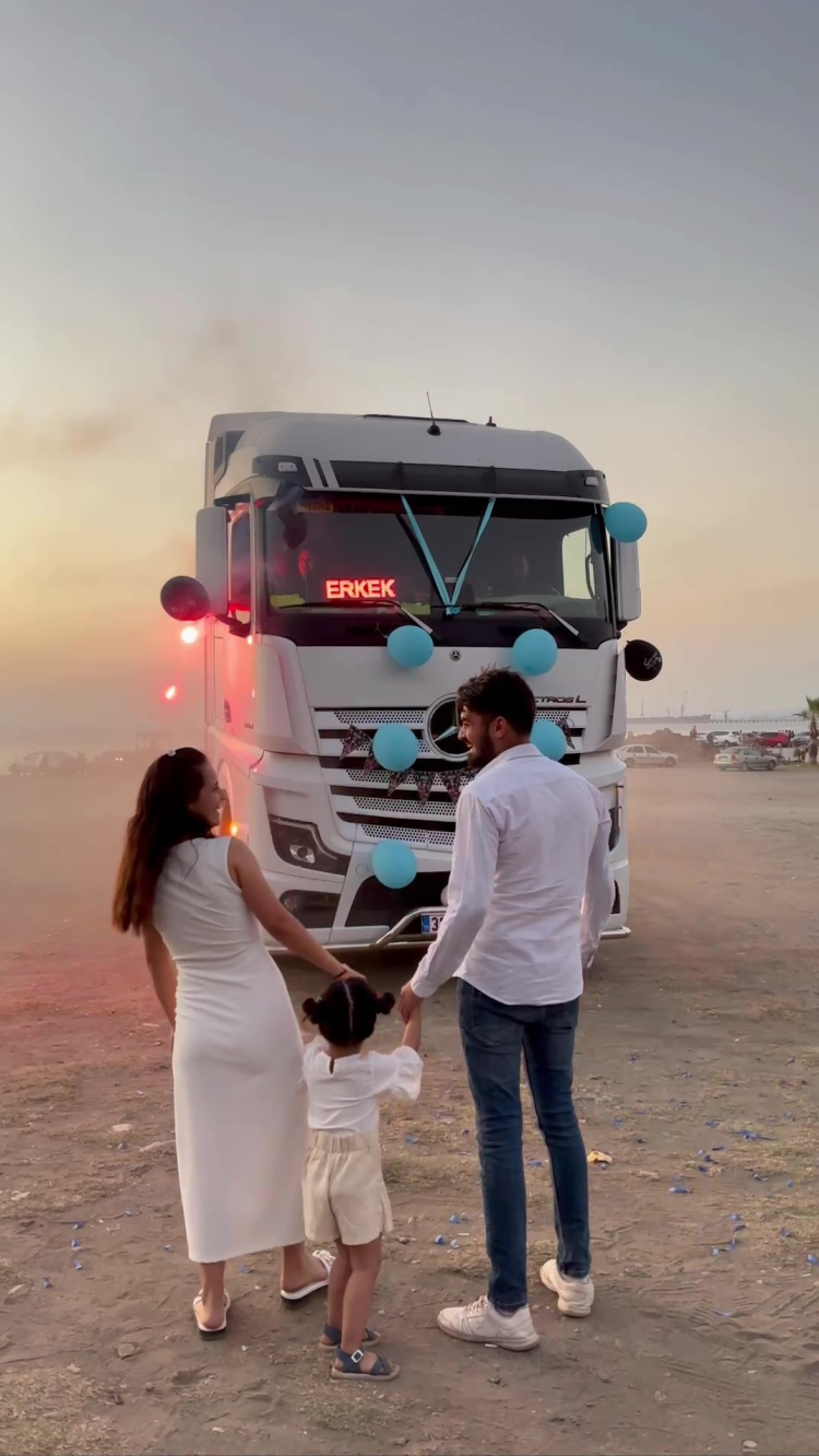 Tır şoförünün meslektaşları, tırlarla parti düzenleyerek aileye evlatlarının cinsiyetini açıkladı.