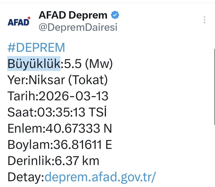 Afet ve Acil Durum Yönetimi Başkanlığı (AFAD) verilerine göre, saat 03.35'te Tokat'ın Niksar ilçesinde 5.5 büyüklüğünde bin deprem meydana geldi. Yerin 6.37 kilometre derinliğinde gerçekleşen deprem, çevre illerde olduğu gibi Samsun'da da hissedildi.