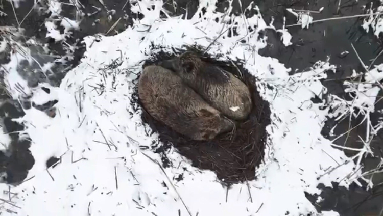 Kars'ın dondurucu soğuğuna ve yaban hayatının sert şartlarına rağmen, bir domuz ailesinin yumak halinde toplu uyku anları, dron çekimiyle kaydedilirken ortaya çıkan görüntüler, doğa belgesellerini aratmadı.