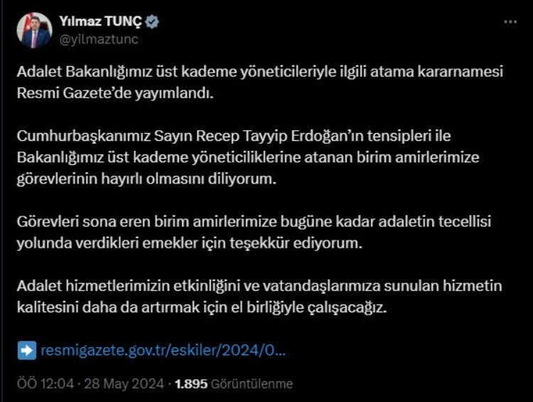 Adalet Bakanlığının üst kademe yöneticileriyle ilgili atama kararnamesi Resmi Gazete'de yayımlandı.