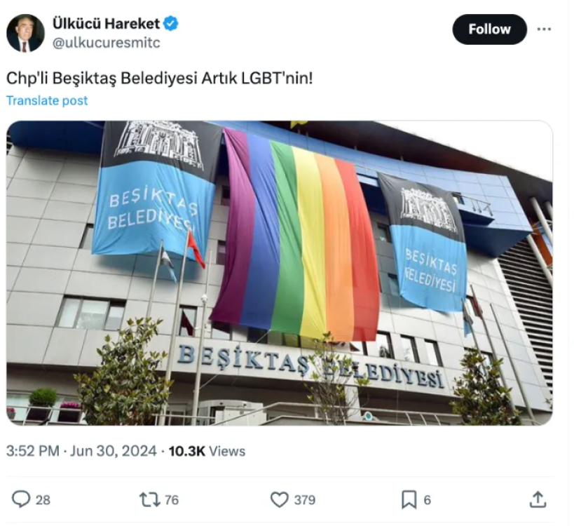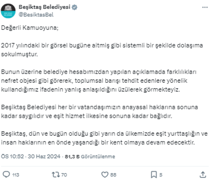 Haziran ayının son haftasında kutlanan LGBTİ+ Onur Haftası kapsamında, İstanbul'da 30 Haziran 2024 günü bir yürüyüş düzenlendi. Sosyal medyada yayılan bir fotoğraf, Beşiktaş Belediyesi binasına LGBTİ+’ları temsil eden bir gökkuşağı bayrağının asıldığı iddiasını yeniden gündeme getirdi.