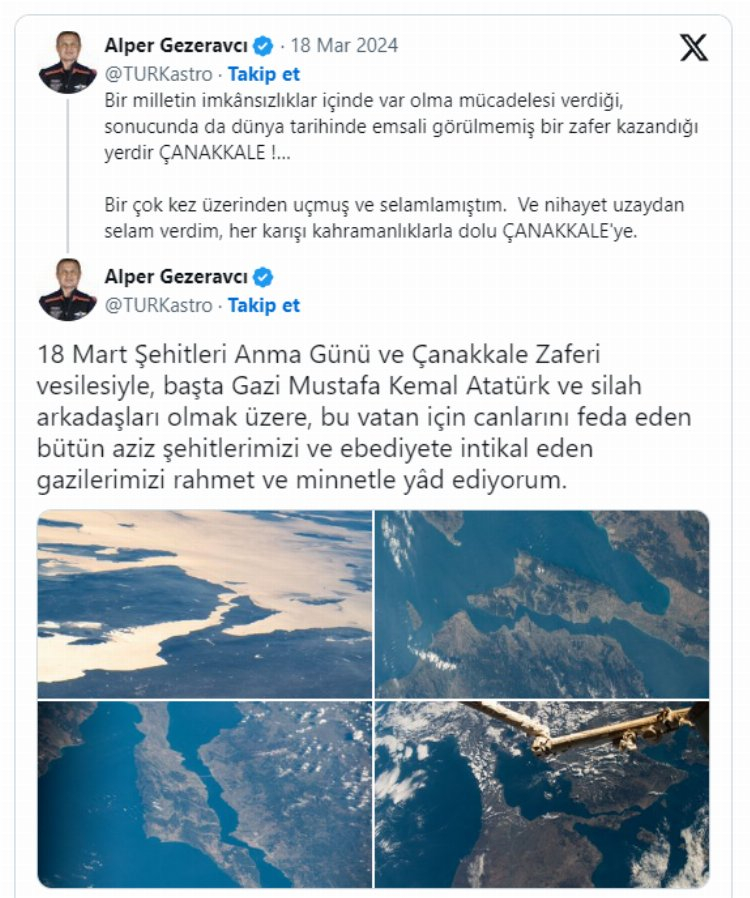 Kahraman ecdadımızın azmi ve fedakarlığıyla kazanılan bu büyük zafer, TUA ve Gezeravcı'nın uzaydan yaptığı paylaşımlarla bir kez daha anlam kazandı. TUA'nın sosyal medya hesabından yapılan paylaşımda, "Kahraman ecdadımızın azmi ve fedakarlığı, tıpkı evrenin sonsuzluğunda kaybolmayan bir yıldız gibi bizlere ışık saçmaya devam ediyor" ifadelerine yer verildi. Bu özel günde, Çanakkale'nin uzaydan çekilen görüntüleri ile zaferin büyüklüğüne dikkat çekilirken, aziz şehitler anısına saygı ve rahmetle yaklaşıldı.