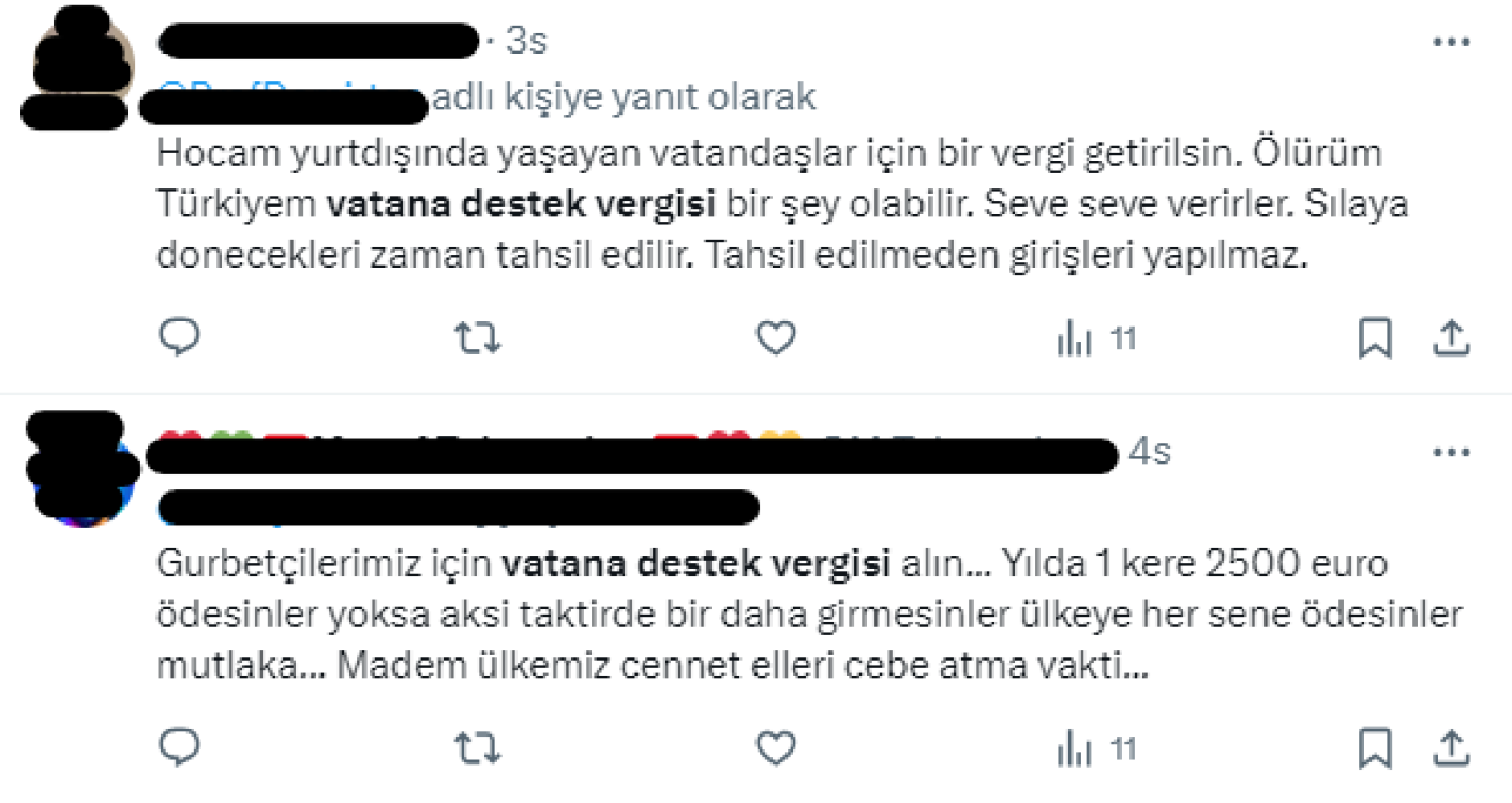 Hazine ve Maliye Bakanlığı’nın hazırladığı yeni vergi paketi tartışmaları devam ederken, sosyal medyada yurtdışında yaşayan ve oy kullanan gurbetçilerden de vergi alınsın önerisi gündem oldu.