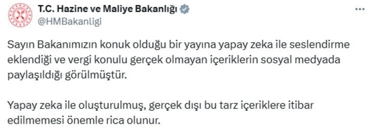 Hazine ve Maliye Bakanlığı'ndan yapılan açıklamada şu ifadelere yer verildi: "Sayın Bakanımızın konuk olduğu bir yayına yapay zeka ile seslendirme eklendiği ve vergi konulu gerçek olmayan içeriklerin sosyal medyada paylaşıldığı görülmüştür. Yapay zeka ile oluşturulmuş, gerçek dışı bu tarz içeriklere itibar edilmemesi önemle rica olunur."