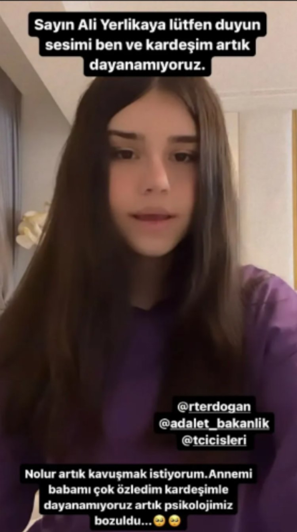 Dilan ve Engin Polat çiftinin kızı Nilda Polat, annesinin hesabından İçişleri Bakanı Ali Yerlikaya'ya seslendi. Kara para aklama ve vergi kaçakçılığı suçlarından dolayı tutuklanan Polat çiftinin çocukları olarak, Nilda ve kardeşi yaşadıkları psikolojik sıkıntıları dile getirdi. Nilda, "Sayın Ali Yerlikaya, lütfen sesimizi duyun. Ben ve kardeşim artık dayanamıyoruz. Benden bütün ailemi aldınız, kardeşim ve benim psikolojimiz bozuldu. Suçları olmadığı halde neden hâlâ içerideler. Kardeşim sürekli ağlıyor. Benim de psikolojim bozuldu. Dayanamıyorum artık" şeklinde duygularını ifade etti.