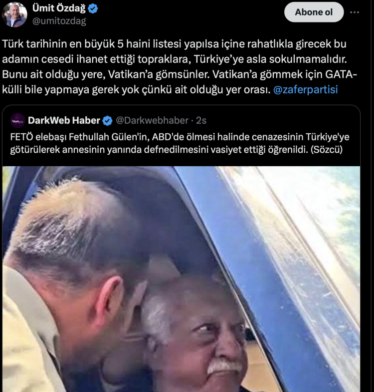 “Türk tarihinin en büyük 5 haini listesi yapılsa içine rahatlıkla girecek bu adamın cesedi, ihanet ettiği topraklara, Türkiye’ye asla sokulmamalıdır” ifadelerini kullandı. Gülen’in cenazesinin Türkiye yerine Vatikan’a gömülmesi gerektiğini belirten Özdağ, “Bunu ait olduğu yere, Vatikan’a gömsünler. Vatikan’a gömmek için GATA-külli bile yapmaya gerek yok çünkü ait olduğu yer orası” dedi.