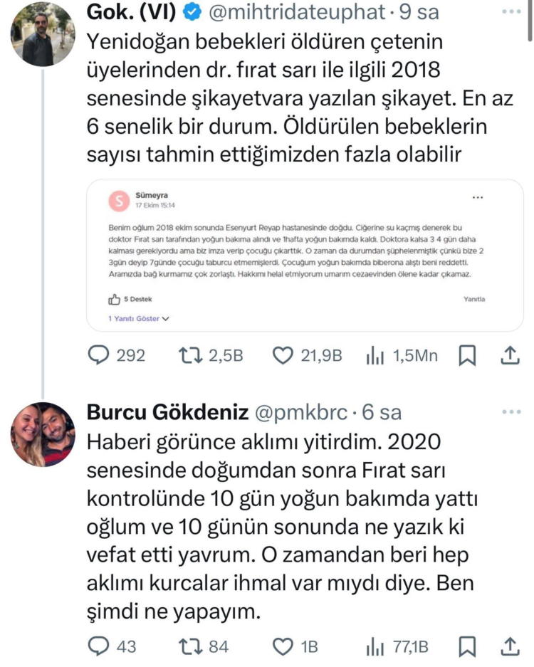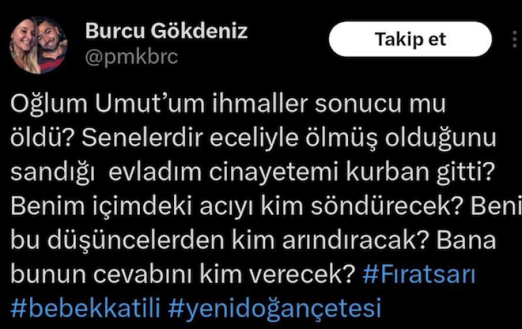 2020 yılında doğumdan sonra 10 gün boyunca oğlunun Fırat Sarı kontrolünde yoğun bakımda kaldığını ve ardından vefat ettiğini belirten Burcu Gökdeniz, çetenin mağdurlarından sadece biri. Oğlunun doğal yollarla öldüğünü zanneden acılı anne, haberlerin ardından kafasında oluşan soru işaretlerini ve acısını sosyal medya hesabından paylaştı.