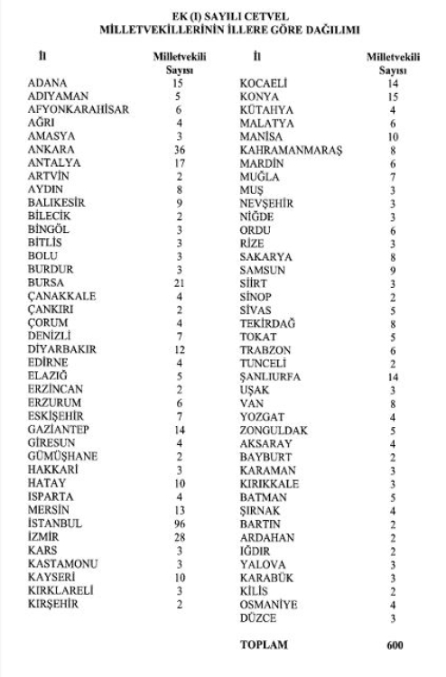 Resmi Gazete'de yayımlanan karara göre İstanbul, Hatay ve Kütahya’nın milletvekili sayısı azalırken, Bursa, Eskişehir, Tunceli ve Bayburt’un vekil sayıları 1'er arttı.