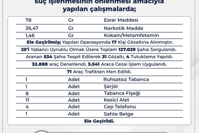 Uygulamalarda, 1 adet ruhsatsız tabanca, 1 adet şarjör, 8 adet tabanca fişeği, 11 adet kesici alet, 4 adet cep telefonu ve 1 adet sahte belge ele geçirildi.