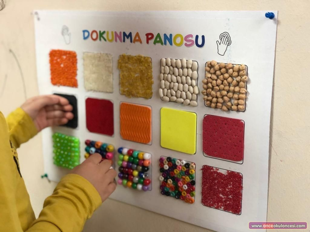 - Malzemeler: Farklı dokularda kumaşlar, yumuşak oyuncaklar, tüyler, pirinç, fasulye gibi gıdalar.