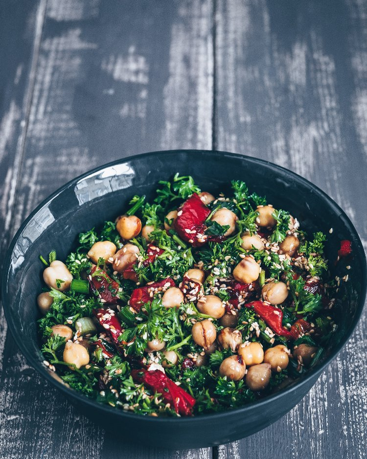 Nar Ekşili Nohut Salatası: Haşlanmış nohut, yeşillikler ve nar ekşili sosla hazırlanan bu salata, tatlı ekşi bir lezzet sunar.