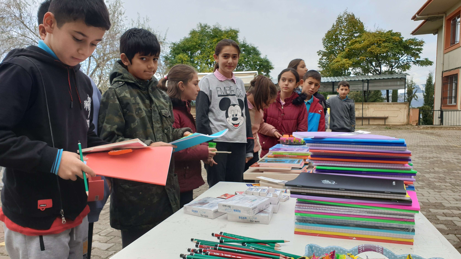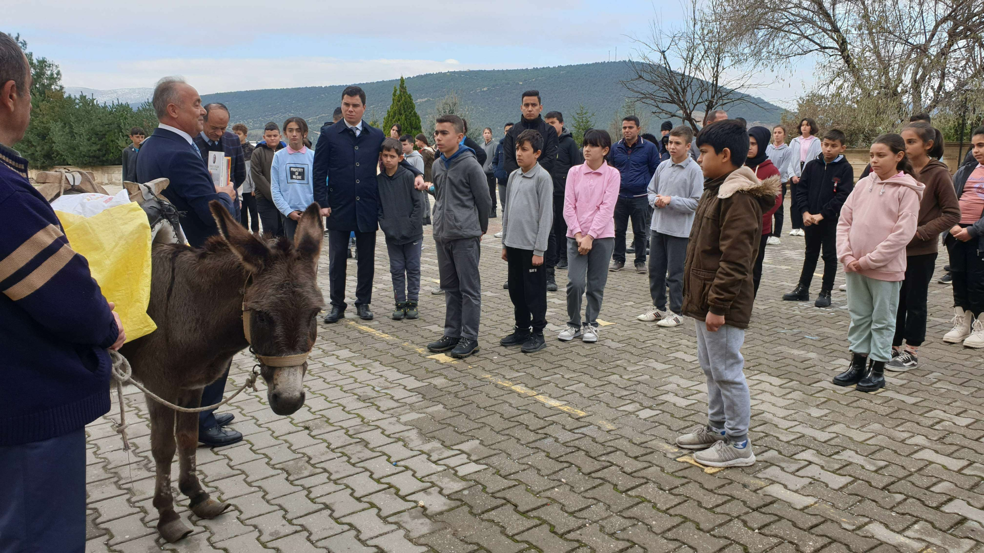 30 yıldır Almanya'da yaşayan "Eşekli Dostoyevski" olarak tanınan Ersin Bilge eşeğiyle beraber geldiği Orhaneli'de öğrencilere defter, kalem, kitap ve kırtasiye malzemesi dağıttı.