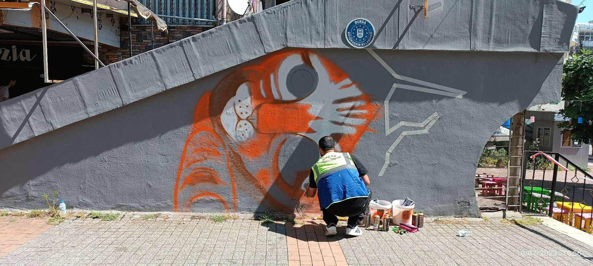 Trafo binaları, istinat duvarları ve köprülü kavşakları tuval gibi kullanıp, cadde ve sokakları sanatla buluşturan Kent Estetiği Şube Müdürlüğü’nün alanında ressamları, Bursa'yı 3 boyutlu sanatla buluşturmaya devam ediyor.