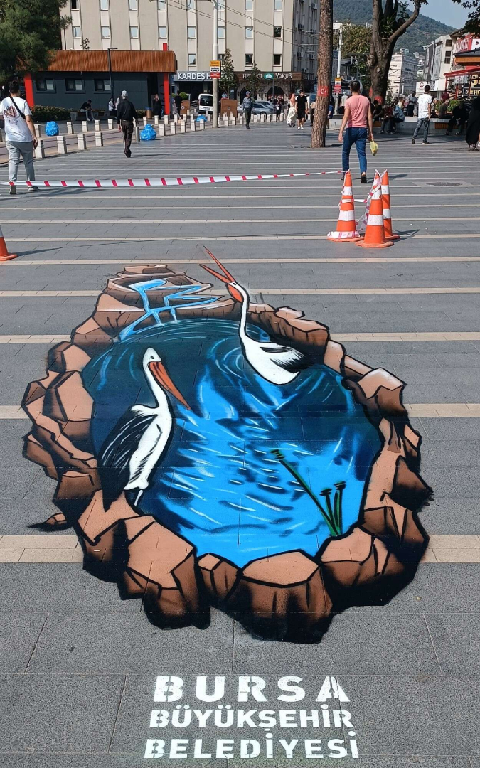 Bursa'da görüntü kirliliğine yol açan trafo binaları, istinat duvarları ve köprülü kavşakları bir tuval gibi kullanıp, sanat eserine dönüştüren Büyükşehir Belediyesi ressamları, özellikle Avrupa sokaklarında örneklerine çokça rastlanan 3 boyutlu resimlerle cadde ve sokaklara değer katıyor.