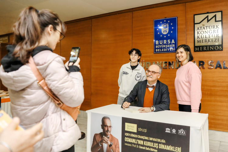 Bursa’nın tarihi birikimini ve kültürel hafızasını gelecek kuşaklara aktarmak amacıyla düzenlenen ‘Bellek Bursa’ söyleşilerinin son konuğu, Tarihçi, Yazar ve Akademisyen Prof. Dr. Emrah Safa Gürkan oldu. "Uçbeyliğinden Cihanşümul İmparatorluğa: Osmanlı’nın Kuruluş Dinamikleri" başlığıyla gerçekleştirilen söyleşiye tarih meraklıları yoğun ilgi gösterdi.