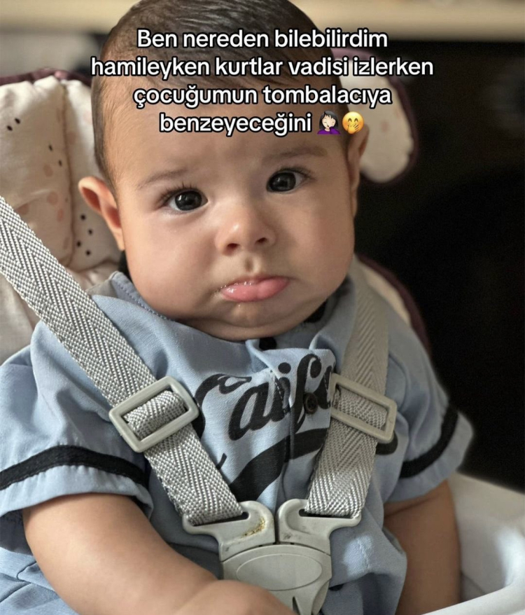 Paylaşıma da ''Nereden bilebilirdim hamileyken Kurtlar Vadisi izlerken çocuğumun Tombalacı'ya benzeyeceğini." notunu düştü.