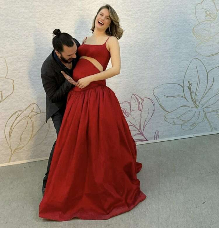Kırmızı uzun elbisesiyle dikkatleri üzerine çeken Burcu Biricik, eşiyle olan karnı burnunda pozlarını hayranlarının beğenisine sundu.