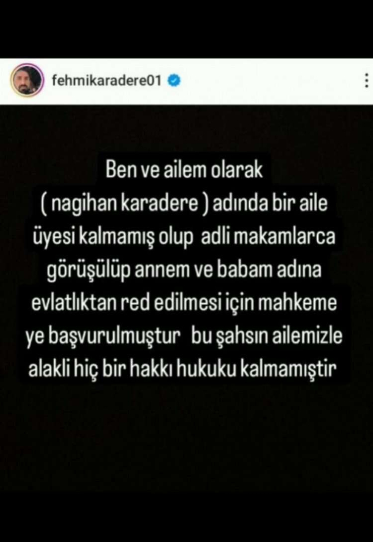 Fehmi Karadere Nagihan Karedere'nşn evlatlıktan red edilmesi için anne ve babasının mahkemeye başvurduğunu iddia etti.