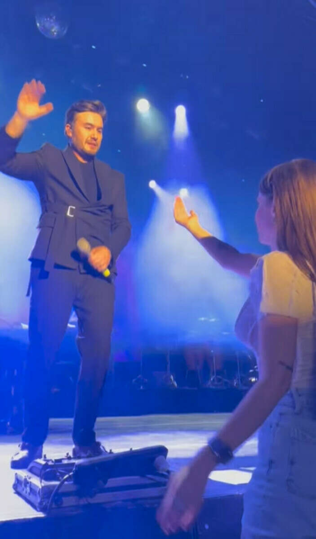 Selin İmer sahneye yaklaşarak Ceceli'yi yanına çağırdı. Şaşkınlığı kameralara yansıyan şarkıcı, eşinin yanına gitti.